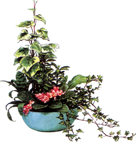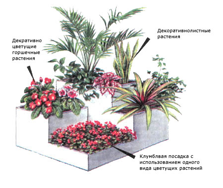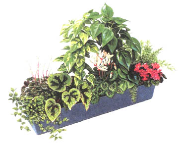 Перед вами богатый выбор растений. Старайтесь подбирать такие, которым нужно примерно одинаковое освещение, полив и температурный режим. Затем вам следует убедиться, что высота и облик растений соответствуют размеру контейнера. Старайтесь добиться разнообразия по высоте, облику растений и текстуре листьев, обратите внимание на сочетание окраски растений. Прежде всего, о высоких растениях, которые задают высоту всей композиции. Будьте осторожны, чтобы не выбрать для небольшого комнатного сада раскидистого гиганта. Сансе-виерия - высокое растение с вертикально расположенными листьями. Гревиллея и дизиготека не затеняют расположенные по соседству растения. Выбрать высокое растение для большой цветочницы, безусловно, легче - тут широко используют пальмы, драцены, фикусы, монстеру и филодендроны. В большинстве композиций общее впечатление создают растения среднего плана. Если вы не хотите полагаться для создания цветовых пятен на цветущие горшечные растения, можно использовать декоративнолистные растения с ярко окрашенными листьями - кордилину верхушечную, у которой красные листья, желтый сциндапсус, пестролистные хлорофитум и плющ, разноцветные кротон, колеус и бегонию королевскую. Наконец, не забудьте о лианах, которые нужны, чтобы смягчить резкие линии края контейнера. Самые распространенные из таких растений - плющ, традесканция, фикус карликовый и зебрина.